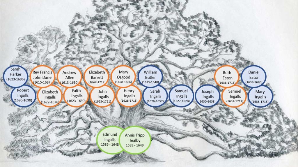 We (Wallace Stephen Ingalls and Julia Mae Porter’s children) are directly descended from Edmund Ingalls and Annis Tealby through the line of their son Henry, Sr. Our lineage is thus: Edmund & Annis Tealby, Henry, Sr & Mary Osgood, Henry, Jr. & Mary Webster Emery, Henry & Hannah Martin, David & Priscilla Howe, Nathaniel & Elizabeth Mckeen, David & Elizabeth Richardson, David James & Louisa Hulda Rollins, Almont James & Charlotte Amelia Perry, Wallace Stephen & Julia Mae Porter.